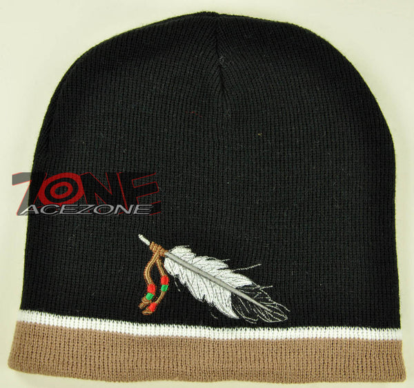 NEW NATIVE PRIDE BIG FEATHER BEANIE KNIT CAP SKULL WN KHAKI