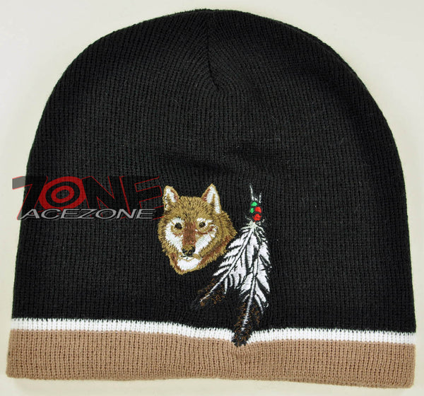 NEW NATIVE PRIDE WOLF FEATHERS BEANIE KNIT CAP SKULL WN KHAKI